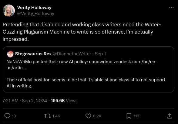This month, the organisers of National Novel Writing Month (NaNoWriMo) released a policy on the use of artificial intelligence, stating how “the categorical condemnation of Artificial Intelligence has classicist and ableist undertones, and that questions around the use of AI tie to questions about privilege.”